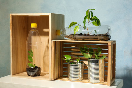 Recycling concept. Metal cans and plastic bottles with growing plants on white table