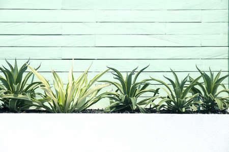Green small bushes of tropical plants with wooden wall background. Nature concept. Place for text.