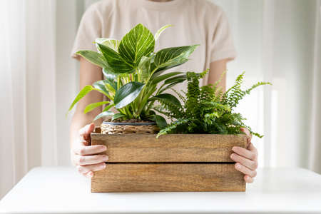Female hands holding wooden box with home plants. New plants delivery by subscription, online shopping. Philodendron Birkin and Nephrolepis Green lady.