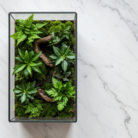 Glass florarium with tropical plants, moss and tree bark on a marble surface. Mini garden with ferns, terrarium for moisture-loving flowers, top view, decorative element.