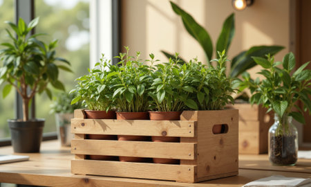 A mocha mousse-colored rustic wooden crate, filled with potted herbs like basil and thyme. The smooth, warm tones