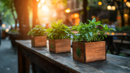Seedlings in pots on a wooden table in a cafe.