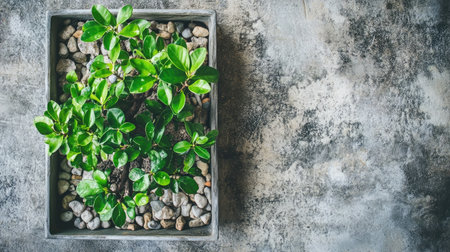 A vibrant arrangement of green plants in a gray planter filled with stones, perfect for adding a touch of nature and serenity to any indoor space.
