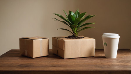 Cardboard box with plant and coffee cup on wooden table. Delivery service concept