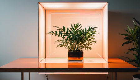 podium for product stand with plant background and cinematic light, front view, minimalist design