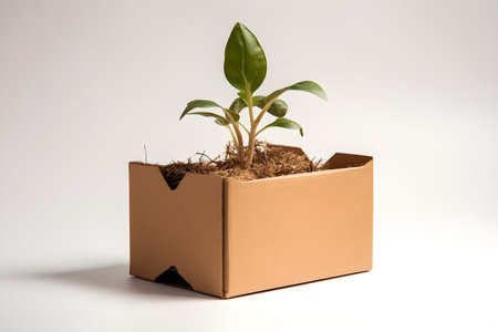 An AI generated illustration of a green succulent plant placed in a small brown cardboard box, on a white background