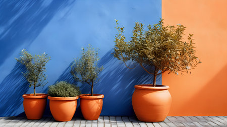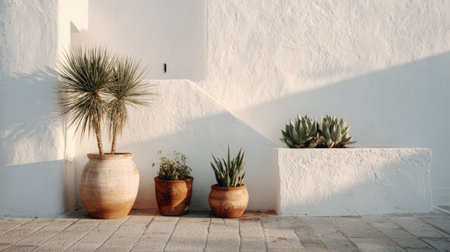 Plants sit in pots on a summer day with soft sunlight illuminating the old street and blank wall in a Mediterranean setting.