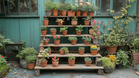 An assortment of potted herbs and vibrant plants arranged on a wooden shelf, providing a lush green ambiance in a garden setting.