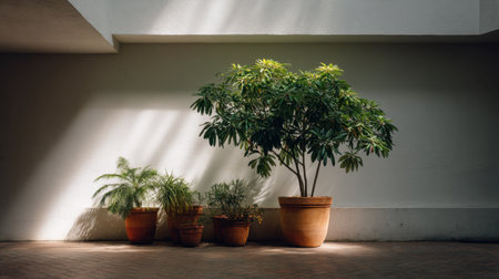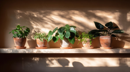 A serene arrangement of indoor plants in terracotta pots showcases vibrant greenery and soft shadows against a neutral wall, creating a tranquil and inviting atmosphere.