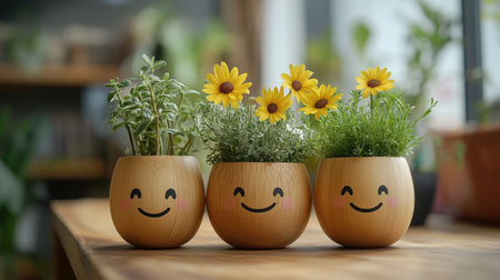 Three wooden flower pots with smiley faces, containing small plants and yellow flowers, create a cheerful atmosphere. Ai generated