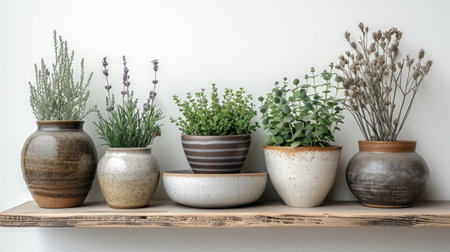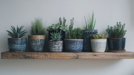A stylish arrangement of indoor plants displayed in artistic pots on a wooden shelf, creating a serene and inviting atmosphere in a well-lit room.