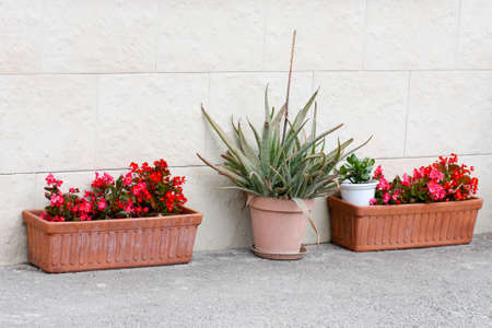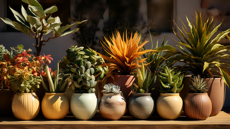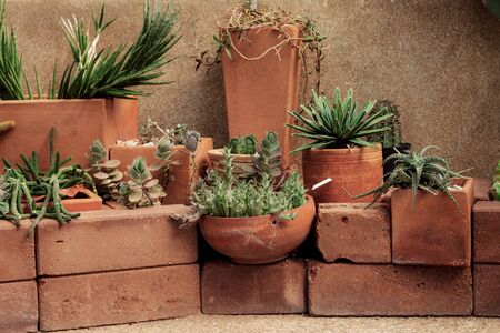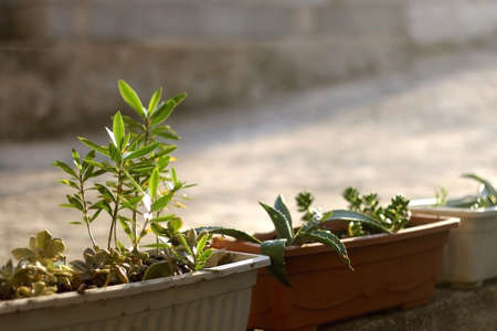 Potted plants and succulents in the garden, illuminated by sunlight. Selective focus.