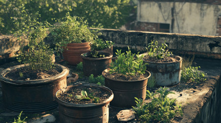 Generative AI : Old vintage flower pot with brown cup at outdoor