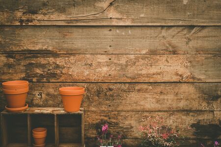 Empty flower pots on wooden shelves against rustic wooden planks with copy space