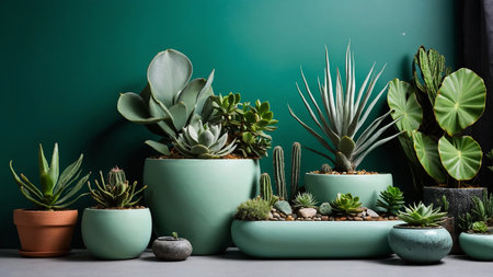 A cozy living room filled with various houseplants in terracotta pots, set against a dark green wall, creating a lush and inviting ambiance with a mix of different green hues and plant textures. AI generated image