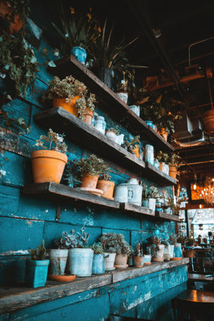 Numerous potted plants adorn wooden shelves against a blue wall, creating a visually rich indoor scene. The composition features diverse plant types and pottery in warm colors contrasted against the cool wall tones. The lighting is soft, suggesting a daytime setting, suitable for interior design or lifestyle applications.