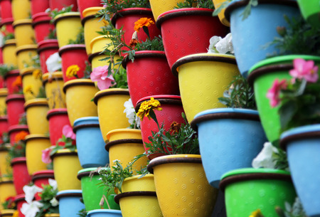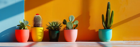 This vibrant image showcases colorful flower pots arranged in a harmonious line against a bright wall, perfect for highlighting the beauty of nature and decor.