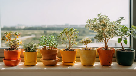 A bright and inviting scene featuring colorful potted plants arranged on a windowsill, showcasing growth and tranquility in an indoor setting.