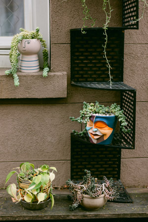 A vibrant display of plants in unique pots arranged on a contemporary shelf in an inviting outdoor area.