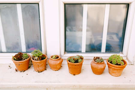 Succulents on the windowsill in the apartment, house cleanliness concept
