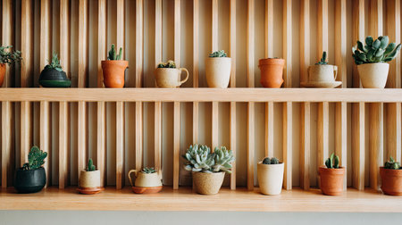 A beautiful display of various potted succulents on a wooden shelf, creating a cozy atmosphere. Perfect for modern home decor and a touch of nature indoors.