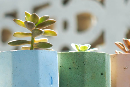 Colorful Succulent Plants in Minimalist Concrete Pots on White Wall in Sunlight