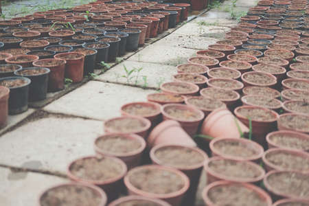 An empty stack of old Flower clay Pot displayed in casual arrangements good copy space.Vintage look.