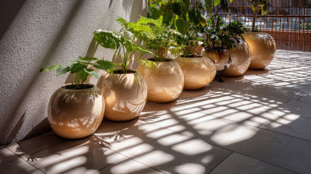 A serene indoor garden showcasing elegant planters filled with lush greenery, enhanced by dappled sunlight creating captivating shadows across a modern space.