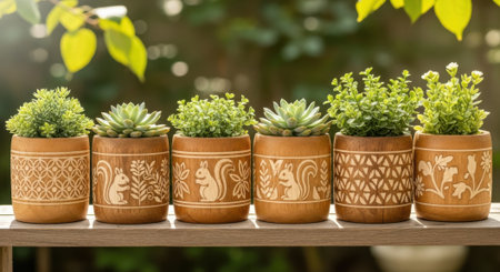 A collection of healthy succulent plants thriving in unique decorative terracotta pots, arranged neatly on a weathered wooden shelf in a garden setting.