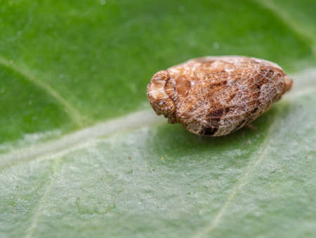 A white insect is on the green leaves in the garden but the insect is dead and has a green background.