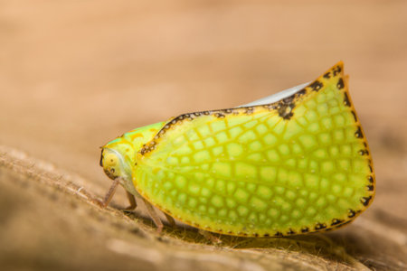 Macro shot of a Leafhopper insect perched on wooden plank.