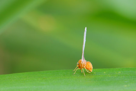 Macro photo of adult citrus psyllid also known as Diaphorina citri on citrus leaf. It is a important pest of citrus crops which is responsible in citrus greening. Used selective focus.