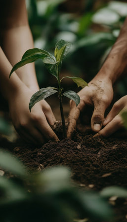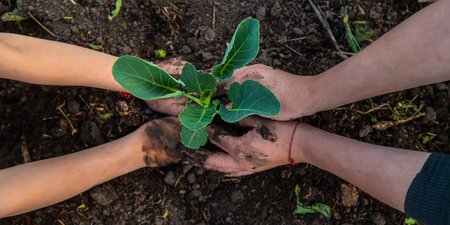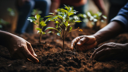 close-up of hands planting a sapling in soil, created with generative ai