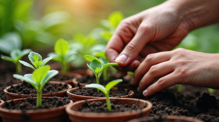 Hands nurturing seedlings while planting in terracotta pots
