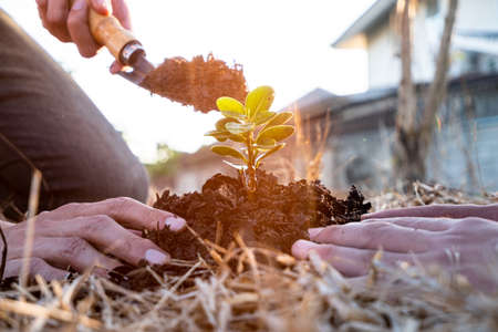Close-up of a person preparing to plant a small tree in the garden to help increase oxygen in the air and reduce global warming and plant a concept tree. love and protect nature