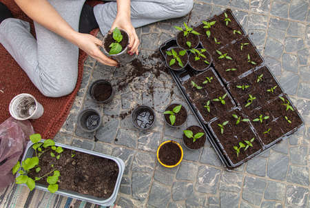 home plant growing concept. human hands transplant seedlings into separate containers with soil. homemade vegetables and herbs