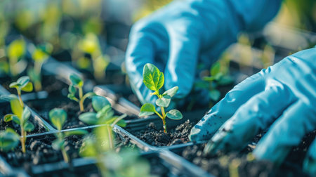 A gardener's hand, wearing a glove, carefully tends a small potted plant. The image showcases soft textures and muted colors, with bokeh lights creating a blurred background. This visual could be used in various commercial applications related to gardening, nature, or environmental themes.