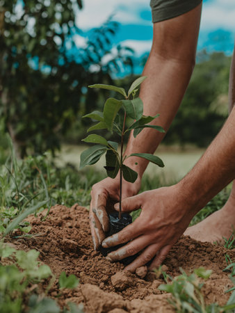 A close-up of hands planting a small tree sapling in the soil, symbolizing reforestation and environmental restoration efforts.