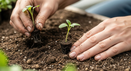 Close-up of hands carefully planting young green seedlings in rich soil. This image represents growth, nature, new beginnings, and sustainability. Perfect for gardening or eco concepts.