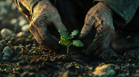 Close-up of elderly hands gently planting a young green seedling in soil, symbolizing care, growth, and connection to nature.