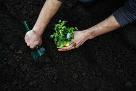 People planting seedlings close up. High quality photo