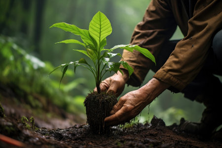 hands planting a sapling in the rainforest, created with generative ai