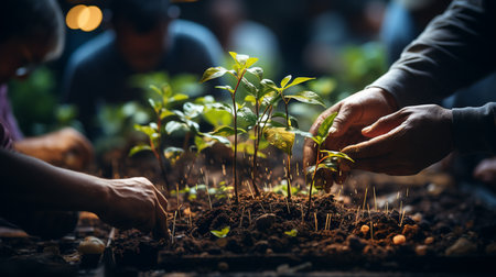 People planting seedlings into soil, volunteers working with saplings, generative AI. Concept of nature, environment, community, growth, tree.