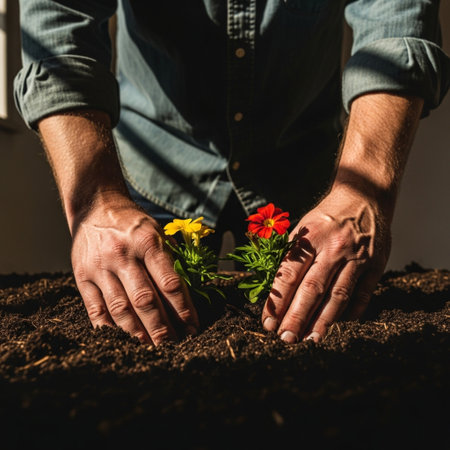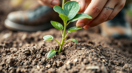 Close-up of hands gently planting a seedling, symbolizing growth and hope.
