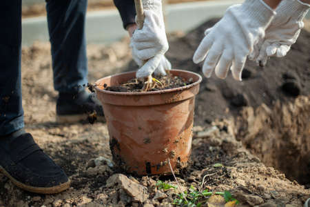 Focus on tree roots, Gardener is putting plant in pot, Gardening at home.