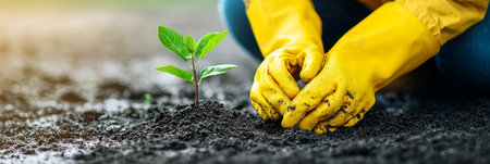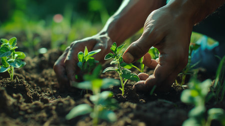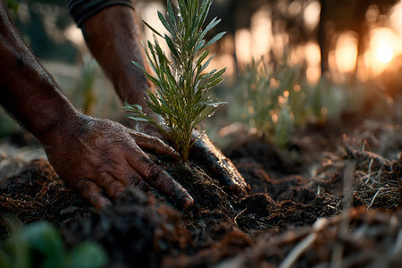 Hands gently planting a seedling into rich soil on an organic farm, symbolizing sustainable agriculture and growth. the warm sunset creates a serene backdrop, the importance of nurturing and environmental conservation. Generative AI