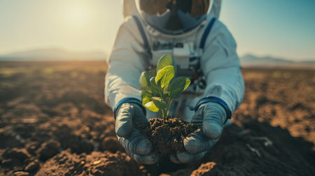 Astronaut holding plants in his hands on an alien planet