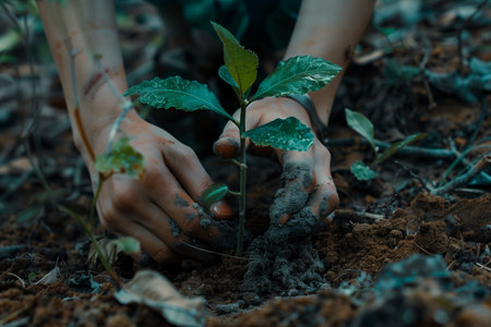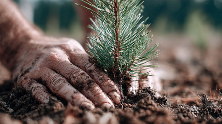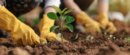 Hands planting a young tree seedling in rich soil, symbolizing reforestation, environmental protection, and a sustainable future