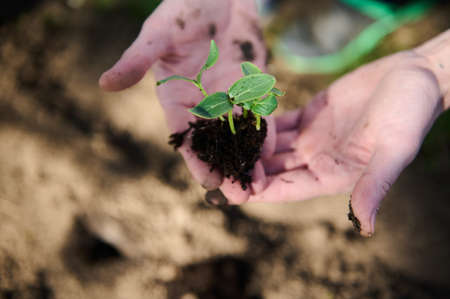 Hands of a farmer are planting seedlings in the garden. Selective focus. nature.