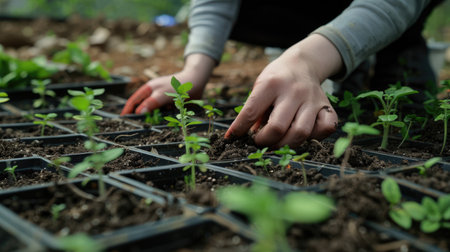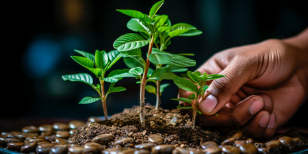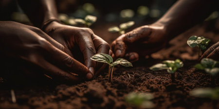 An AI generated illustration of hands working with soil and sprouting plants